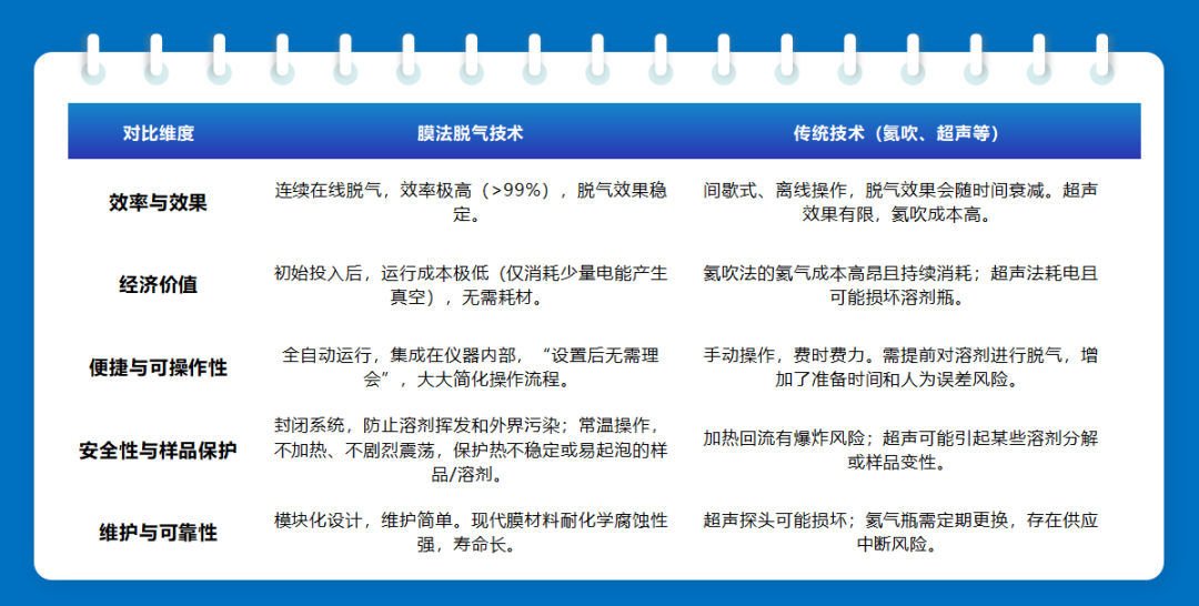 传统脱气方法包括氦吹脱气、超声脱气、加热回流脱气等。与这些方法相比,膜法脱气技术展现出了全方位的优势: